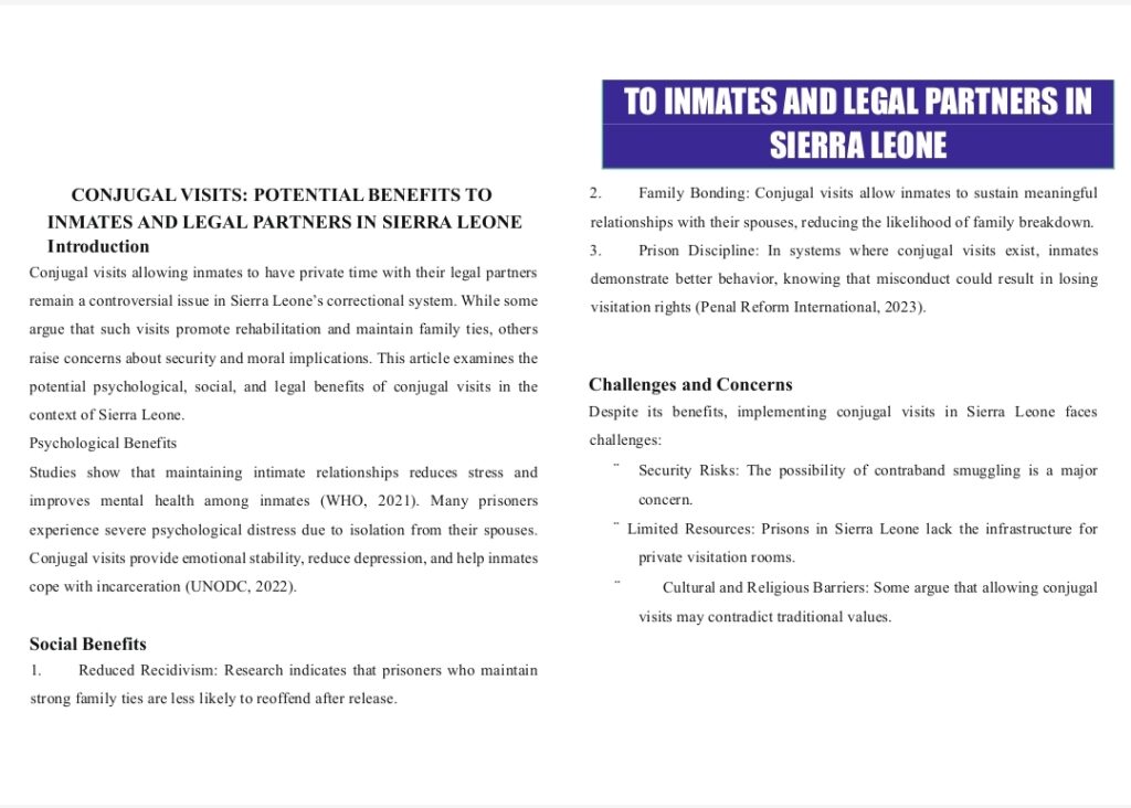 The introduction of conjugal visits in Sierra Leone’s correctional facilities has the potential to bring about significant benefits for inmates and their legal partners.