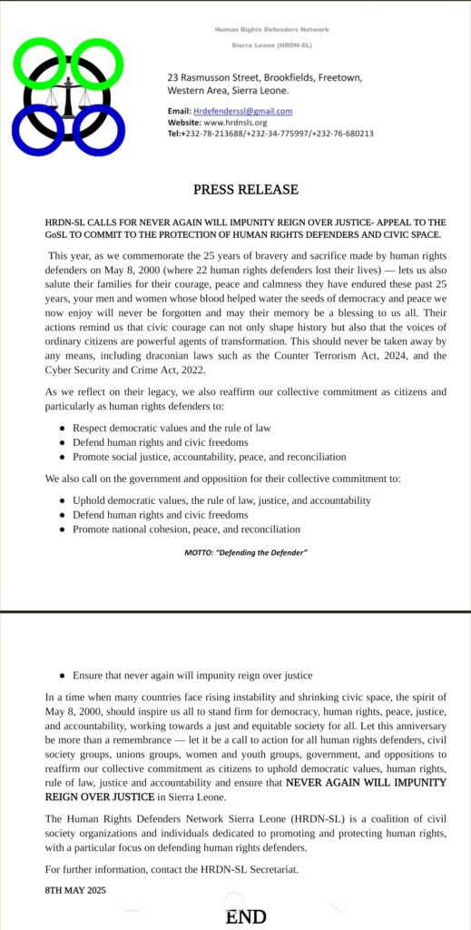 HRDN-SL CALLS FOR NEVER AGAIN WILL IMPUNITY REIGN OVER JUSTICE-APPEAL TO THE GoSL TO COMMIT TO THE PROTECTION OF HUMAN RIGHTS DEFENDERS ANDCIVIC SPACE.