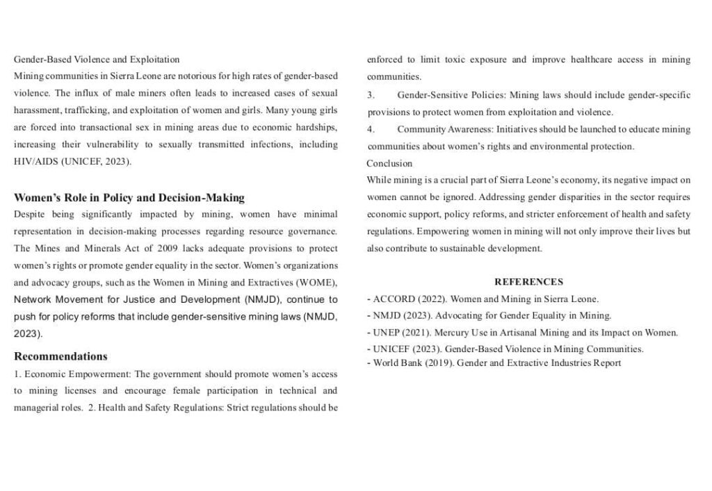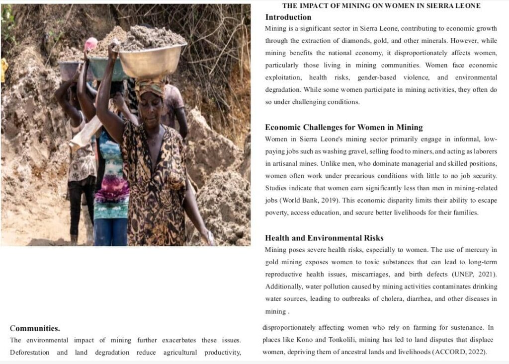 Mining is a significant sector in Sierra Leone, contributing to economic growth through the extraction of diamond, gold and other minerals. However, while Mining benefits the national economy it’s disproportionately effect women particularly those living in Mining communities.